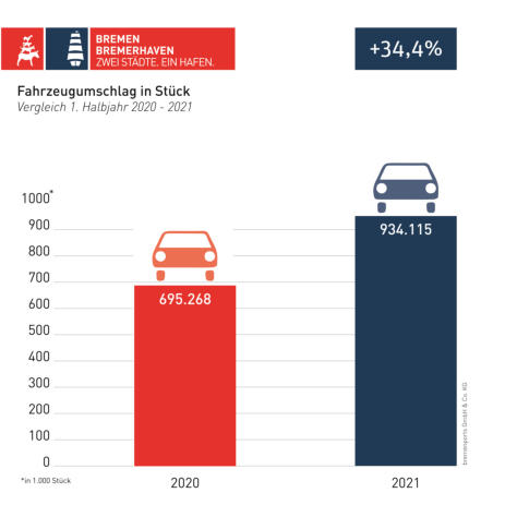 Fahrzeuge wurden im ersten Halbjahr in den bremischen Häfen umgeschlagen, eine Steigerung von